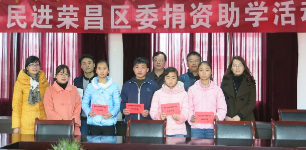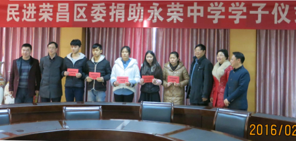 2016年2月26日,开学之际,民进荣昌区委再次开展助学活动。到荣昌区峰高中学和永荣中学,向10名贫困学生每人发放助学资金1000元,并向贫困学生发出“努力学习,回报社会”的倡议,希望受资助的学生把暂时的贫困作为精神财富,把感激化为学习动力,自力更深,奋发图强,刻苦攻读,用实际行动回报社会。