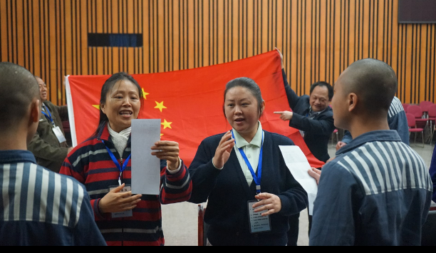 活动开始前,主持人拿出一面崭新的国旗,几名爱心家人和服刑未成年人小心翼翼将其展开并高高举起。在鲜艳的五星红旗下,爱心家人与未成年服刑人员齐声高唱《歌唱祖国》,以简单而庄重的仪式拉开这次活动的序幕。