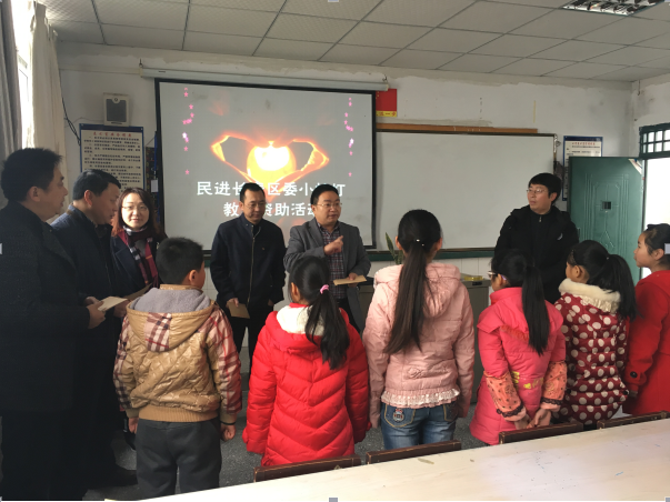 2016年12月6日,民进长寿区委专职副主委吕兴建,副主委邓雪峰、李佳等来到长寿八颗中心小学,对6六名家庭贫困的留守儿童进行爱心帮扶,向每人捐赠1000元助学金,为他们送去岁末的温暖。