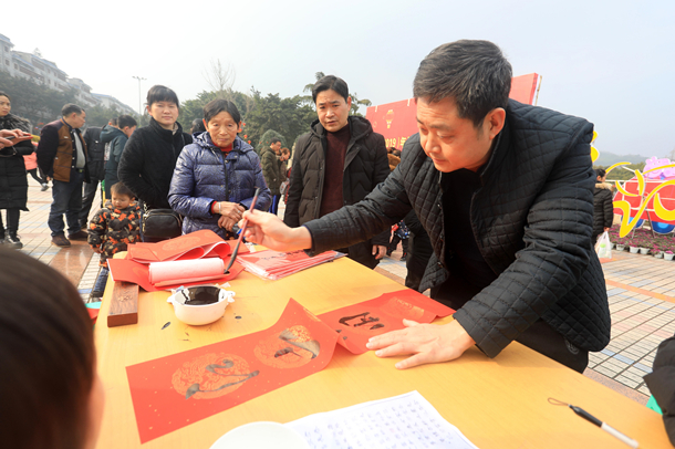 1月20日,己亥(2019)年民进全国‘春联万家’大足区分会场活动在区宏声广场举行。民进大足区委主委、区政协副主席李志出席活动。大足区多名民进会员参加活动并为过往市民义务书写和赠送春联500条幅。