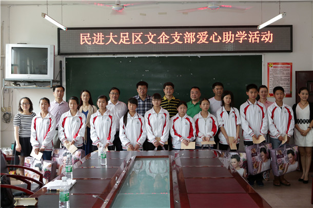 随后,会员们来到大足石刻传说传承基地大足区双塔中学,开展了爱心助学活动。区政协副主席、民进大足区委主委李志,大足区教委副主任伍天泽出席。