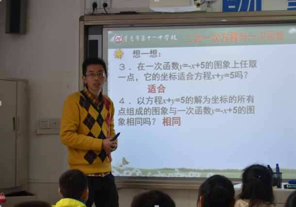 活动中,支部会员娄凌翔老师执教了一堂题为“二元一次方程与一次函数”的数学课。娄老师教学思路清晰,循循善诱,层层引导,逐步推进,并注重讲练结合,学生听课认真,回答问题积极,整堂课达到了很好的教学效果。