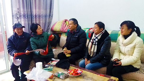 1月14日上午,在新春佳节即将到来之际,民进载英中学支部支部主委蒋进、副主委杨维诺、支部委员张启琼等带领部分支部会员走访慰问了80岁高龄的老会员宋文波老师,并代表全体支部会员送上新春祝福。