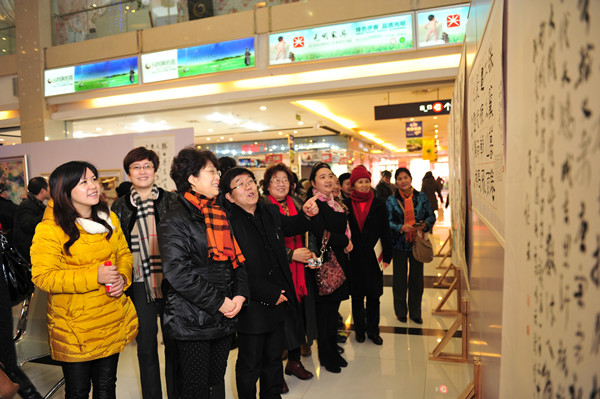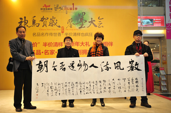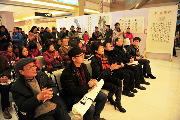 1月4日上午,江北区欧亚达家居一楼展厅里翰墨飘香,人声鼎沸,洋溢着浓厚的文化氛围。由民进重庆市委和民进陕西省委主办,陕西民进开明画院和重庆民进开明画院及欧亚达承办的“共筑中国梦 挥毫万里行”书画联展在这里举行开幕仪式,来自两地民进开明书画院的近100幅优秀书画作品精彩亮相,向大家展示书画艺术的魅力。民进重庆市委专职副主委张克敏、两地民进开明书画院和相关处室负责人出席开幕式,上百名民进会员在内的众多参观者来到展厅,兴致勃勃地欣赏着一幅幅艺术之作。