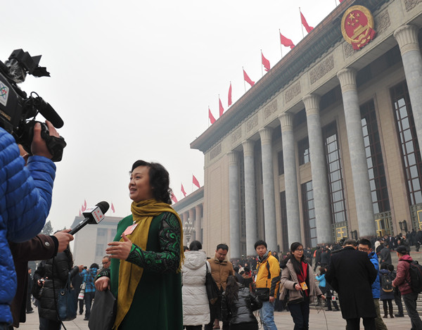 2014年3月3日14:33分,北京人民大礼堂,在会议开始前,全国政协委员张礼慧接受央视的采访。