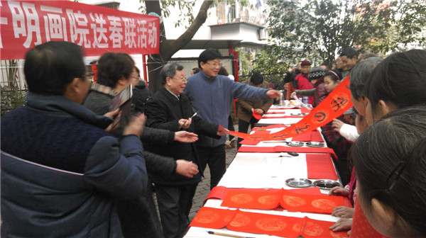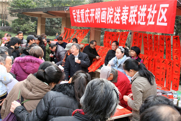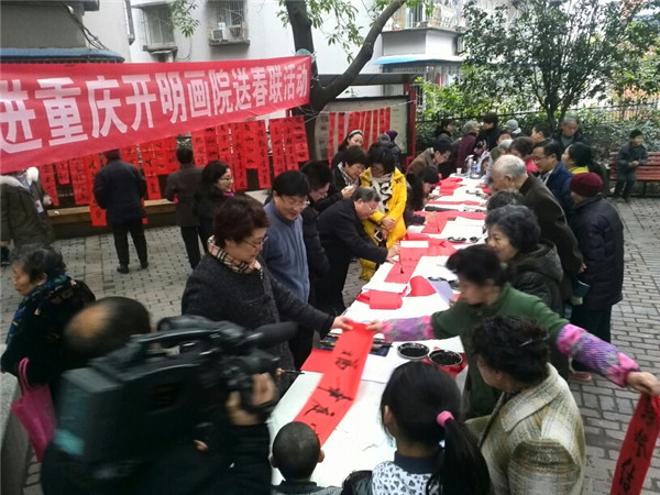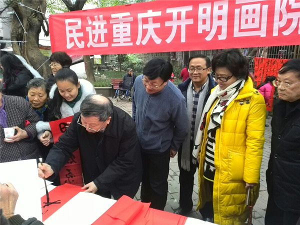 2015年2月5日、6日,民进重庆开明画院分别在渝中区人和街社区和江北区大兴社区开展“送春联进社区”活动。