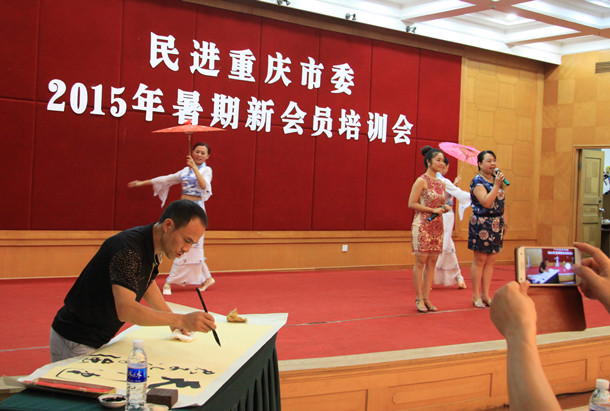 夏日的风摇曳着巴川河畔醉人的柳绿,千年巴岳古寺千年的钟声幽幽。听,黄桷门下的窃窃私语,那是花开的声音,娓娓讲述安居古城万古流芳的动人传说:龙乡情悠悠,铜梁意邈邈。——悠扬的歌声,曼妙的舞姿,行云流水的现场书法,热烈的掌声、欢呼声,铜梁民进新会员们一出场就是个满堂彩,将民进重庆市委2015年暑期新会员培训联欢晚会的气氛直接带入火热的七月。
