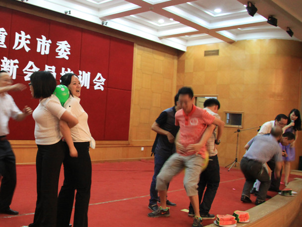 不得不说的还有晚会的游戏。第一个游戏是喊数抱团。看样子有些会员玩过这游戏,很有经验,有些从未接触过的,在台上那就显得手足无措,经常搞不清楚东西南北了,音乐配的比较时尚,台上会员必须根据音乐表演各种小动物造型,惹得台下的笑得东倒西歪。第二个游戏挤爆气球吃西瓜,考验人啊,吹气球的那个肺活量一定要大哟,吃西瓜的若是“大胃王”最好哟,关键还要团队配合,挤爆气球一定要快……满场的呐喊助威欢呼,相机手机咔咔咔,拍的被拍的哈哈哈,毫不掩饰的开心,多么难得!