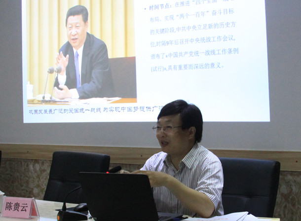 陈贵云作中央统战工作会议精神主题报告。他结合党派工作和自己的学习体会,通过主要精神解读和原文摘读,深入浅出地引导大家对中央统战工作会议、习近平总书记重要讲话精神、统一战线工作条例,特别是涉及多党合作、民主党派等方面的内容,进行了认真学习。陈贵云指出,中央统战工作会议部署统战服务“四个全面”,解决了制约多党合作事业发展的一些重点难点问题;《条例》明确了统一战线服务“四个全面”战略布局的方向原则,丰富了统一战线的基础理论,体现了党关于统一战线的重要方针政策;习近平总书记重要讲话和《条例》对全面推进统一战线事业具有根本性、全局性、长远性的指导作用。为多党合作事业带来了难得的发展机遇, 对多党合作事业长远发展具有至关重要的意义。他指出,会议的召开和《条例》的制定,特别是习总书记的重要讲话,将使统战工作得到前所未有的重视,统战工作范围更加广泛、内容更丰富、程序更加规范、责任更加明确;统战对象责任、权利更明确,履职任务更多、履职要求更高;党派建设中长期存在的问题将会得到解决,但对民主党派从组织到个人的准备要求也更高。他强调,民进重庆市委要认真学习贯彻讲话、条例、会议精神,思进取、抓贯彻、出实效,不断巩固共同思想政治基础,着力抓好组织发展,抓好基础组织建设,着力提升干部能力,严格会议制度和严肃会议纪律。