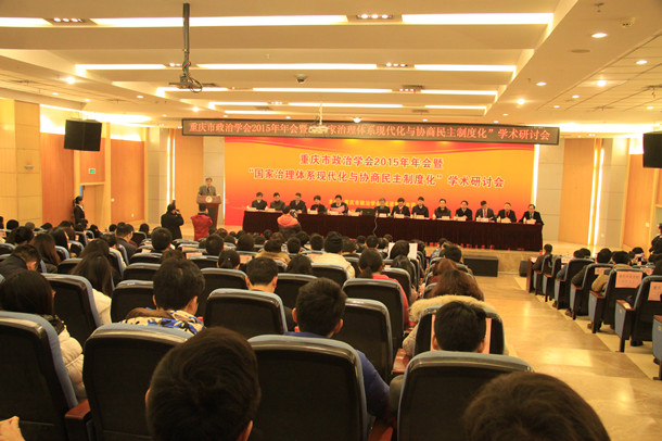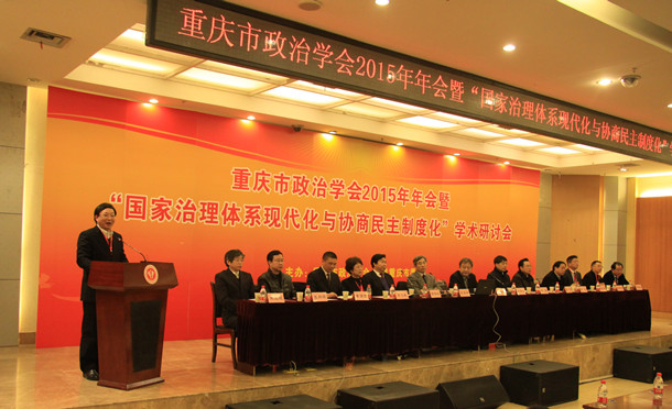 2015年12月28日,由重庆市政治学会与民进重庆市委联合举办的重庆市政治学会2015年年会暨“国家治理体系现代化与协商民主制度化”学术研讨会在西南政法大学举行。来自中国政治学会、重庆市政治学会、市政协、市委统战部、民进重庆市委、重庆市有关高校、科研院所和北京、上海、天津、四川、湖北、甘肃以及武汉、青岛等地民进组织的100多名领导和专家学者与会并围绕会议主题展开学术研讨。