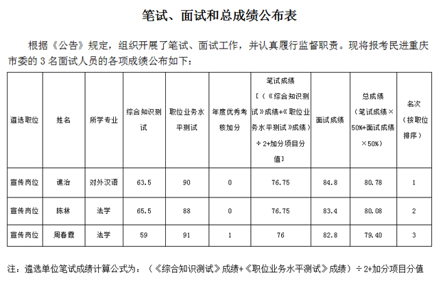 民进重庆市委2017年上半年公开遴选笔试、面试和总成绩公布表