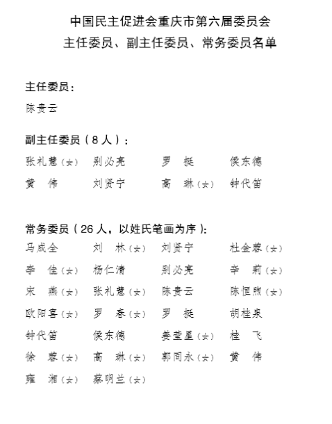 会议期间举行的中国民主促进会重庆市第六届委员会第一次全体会议,选举产生了第六届常务委员会和新一届市委会领导班子,陈贵云当选主任委员,张礼慧、别必亮、罗挺、侯东德、黄伟、刘贤宁、高琳、钟代笛当选副主任委员,决定了内部监督委员会组成人员。中国民主促进会重庆市第六届委员会第一次常务委员会会议任命欧阳喜为秘书长。