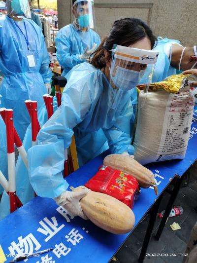 “请大家排好队,保持1米间距,把房号标注在便条上,我们待会统一送到每栋楼下。”8月23日上午9时,鱼洞街道箭河社区上城时代(高风险区),民进会员、巴南区群团服务中心副主任王双正在开展志愿服务,对小区居民所购新鲜蔬果、日用品、药品和母婴用品等各种物资进行消杀,并送货上门。“穿着防护服,戴上面罩、口罩,在40度以上高温下,拎着大米、牛奶、西瓜来回跑,衣服全湿透了,有时还觉得呼吸不畅。”王双说,每个班有5名志愿者,工作时长6—8小时,志愿送货上门工作量很大,一个小时要送约300包,高峰期一个小时要送约600包,有些物资还特别重。尽管条件艰苦,王双还是按照分班安排,坚持每天去值守,和其他志愿者一起,有力保障了小区约7500名居民的正常生活。