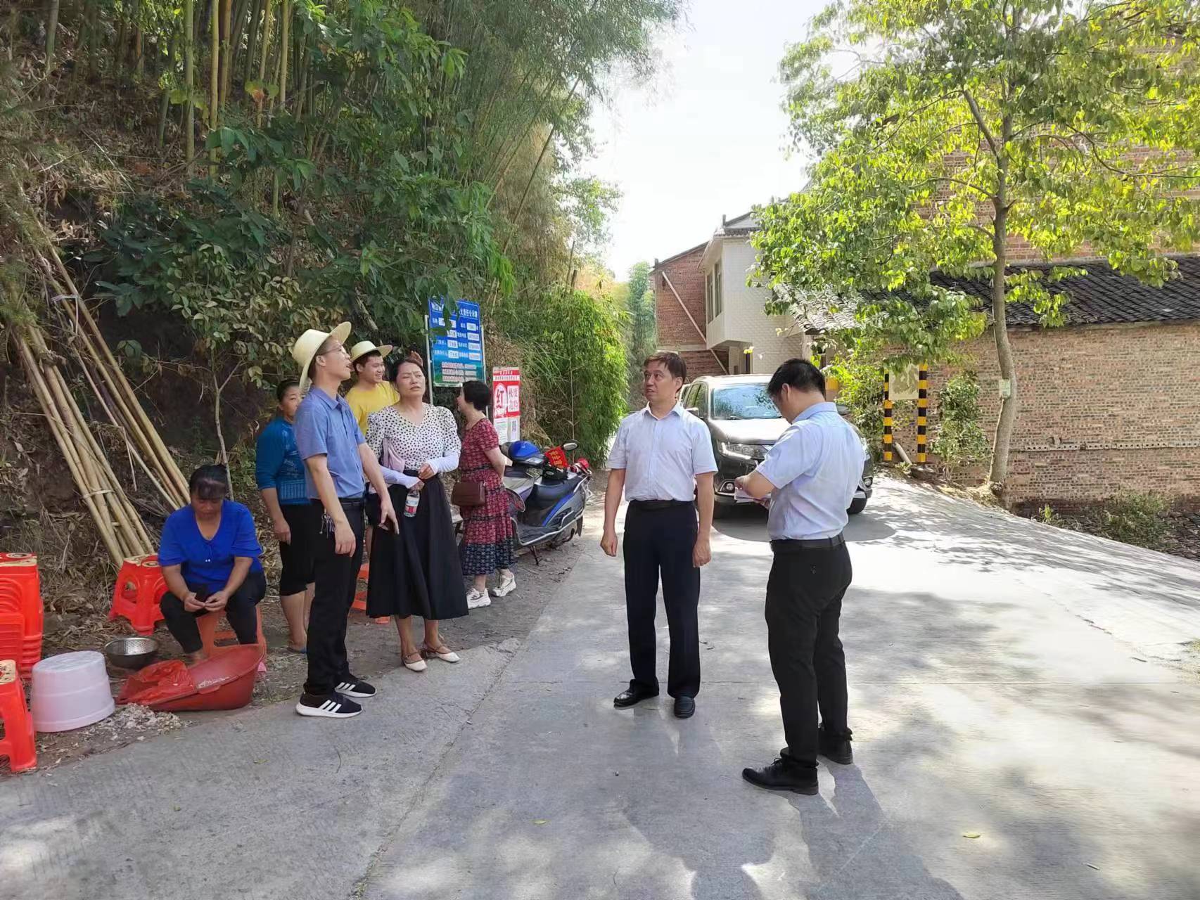 民进梁平区支部副主委、梁平区文联主席罗春(左二)到梁平区仁贤镇察看种植业受灾情况。