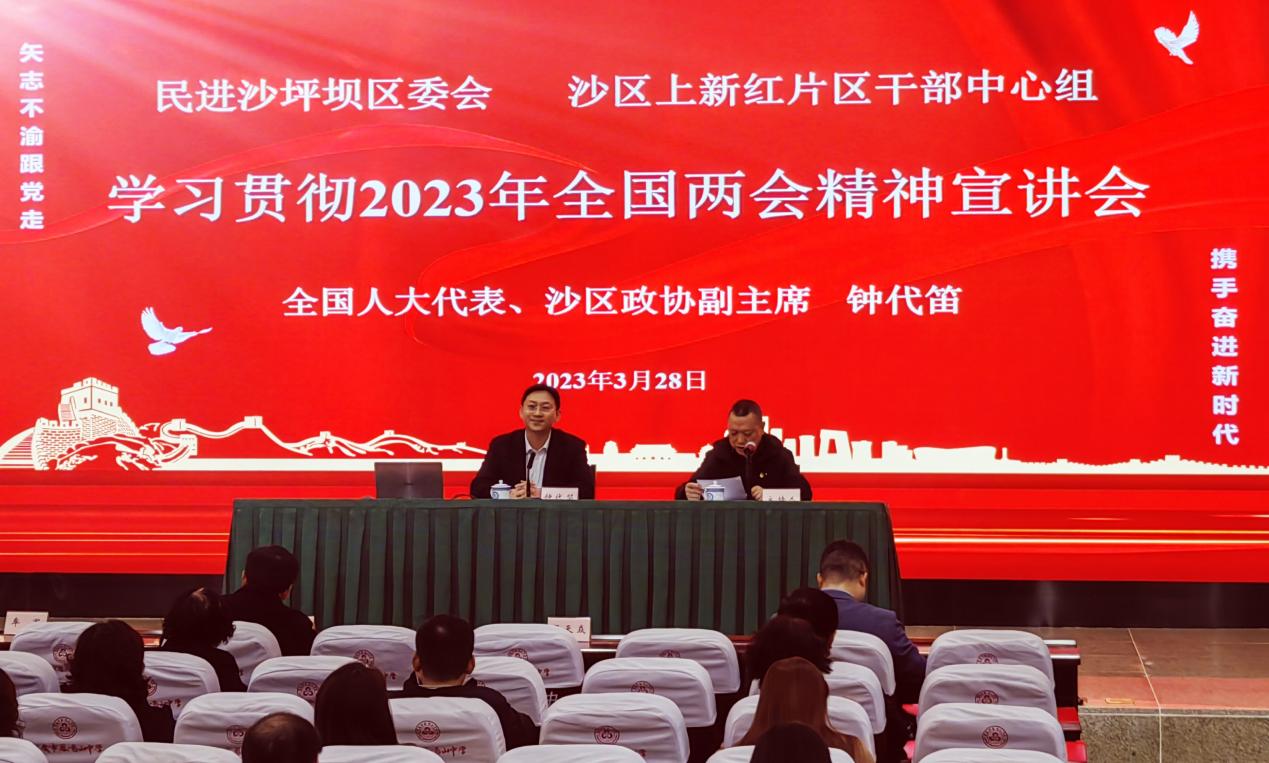 3月28日下午,民进沙坪坝区委会在重庆市凤鸣山中学召开全国两会精神宣讲会,全国人大代表、民进重庆市委会副主委、民进沙坪坝区委会主委钟代笛为民进会员、区教委相关负责人、区教育系统上新红片区干部中心组全体校级干部、凤鸣山中学教师等100余名参会人员作了全国两会精神宣讲。